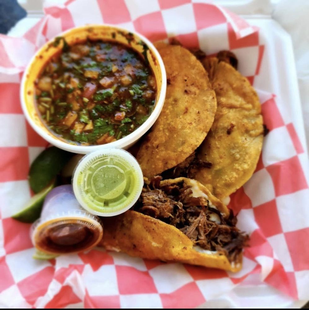 3 tacos. Birria with melty cheese, onions, and cilantro. Served with a side of the birria juice.